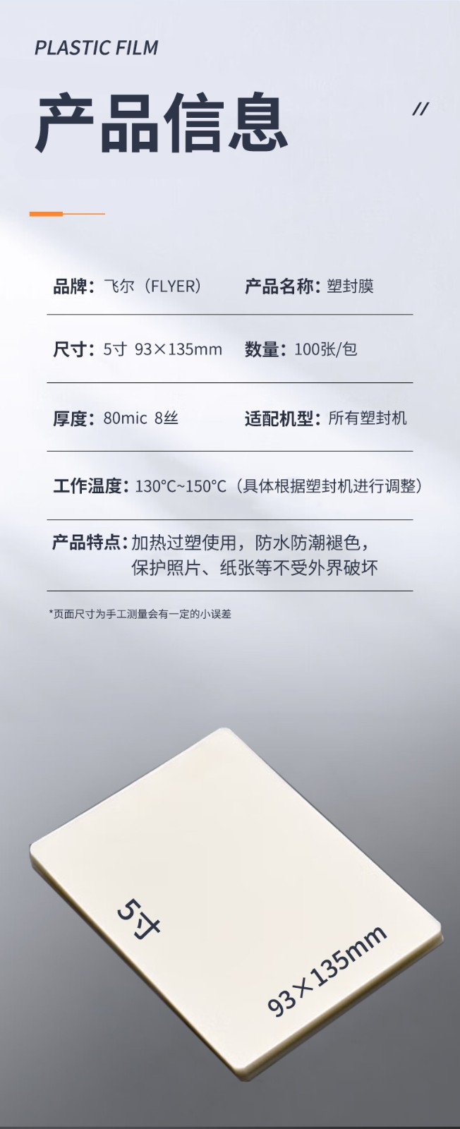飞尔 塑封膜 照片过塑膜封塑膜 菜单热塑膜 文件过胶纸 树叶标本护卡膜 证件塑封机过塑纸覆膜纸 80min 5寸 100张/包 80包/箱 自营