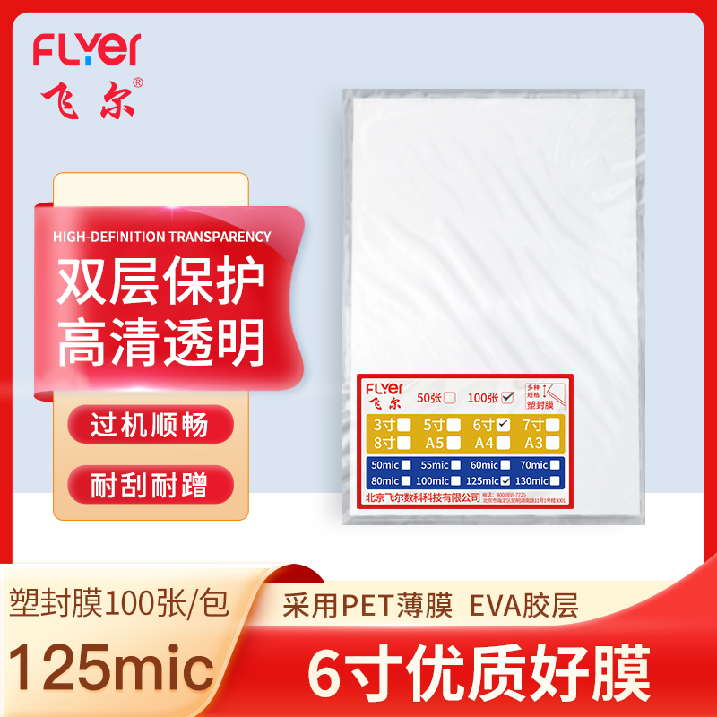 飞尔 塑封膜 照片过塑膜封塑膜 菜单热塑膜 文件过胶纸 树叶标本护卡膜 证件塑封机过塑纸覆膜纸 125min 6寸 100张/包 40包/箱 自营
