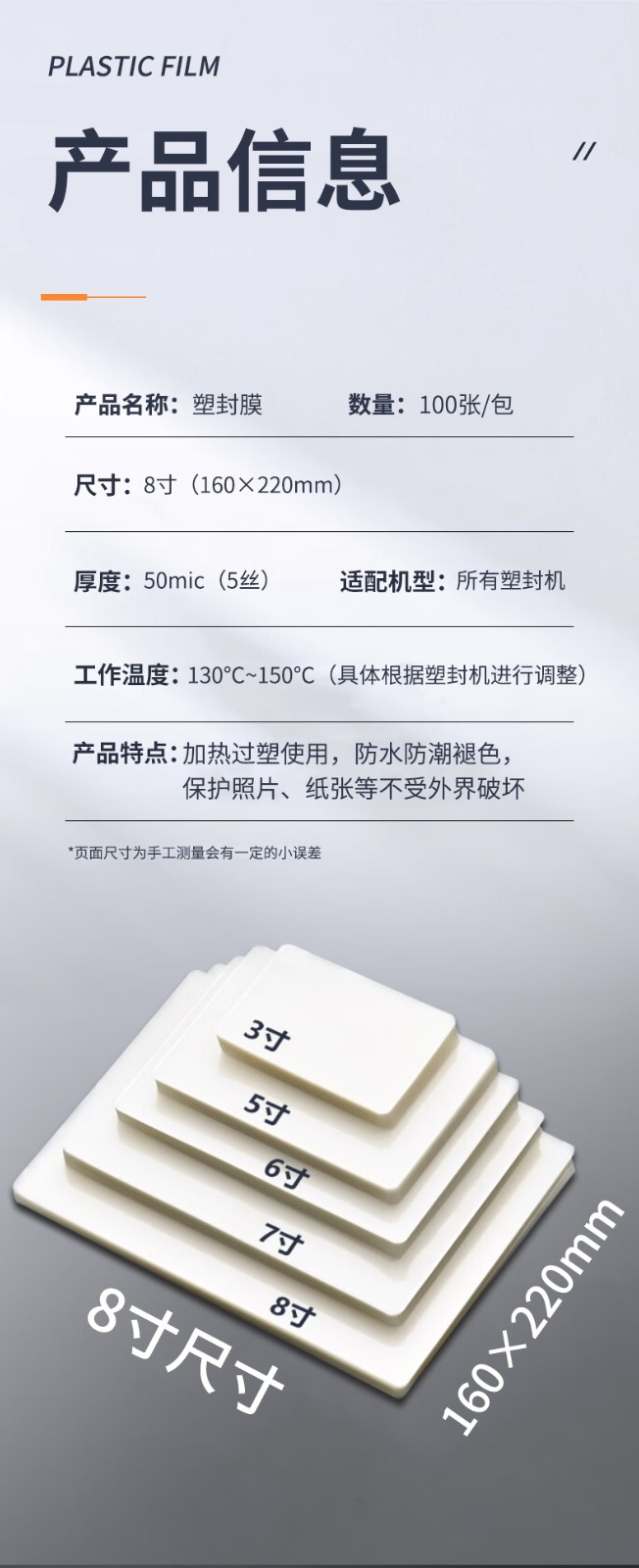 飞尔 塑封膜 照片过塑膜封塑膜 菜单热塑膜 文件过胶纸 树叶标本护卡膜 证件塑封机过塑纸覆膜纸 50min 8寸 100张/包 60包/箱 自营