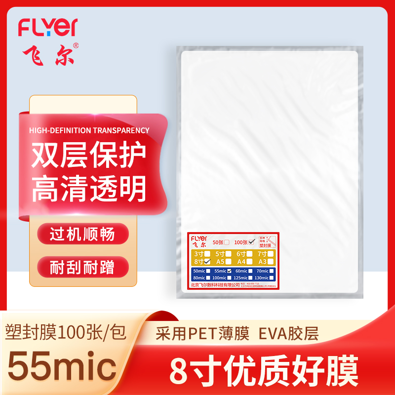 飞尔 塑封膜 照片过塑膜封塑膜 菜单热塑膜 文件过胶纸 树叶标本护卡膜 证件塑封机过塑纸覆膜纸 55min 8寸 100张/包 自营