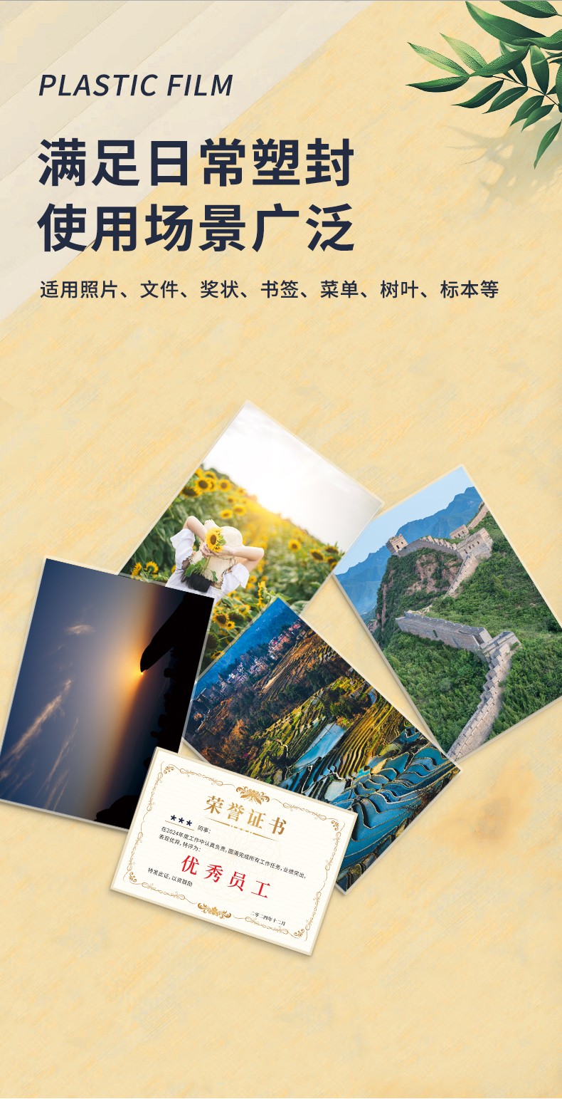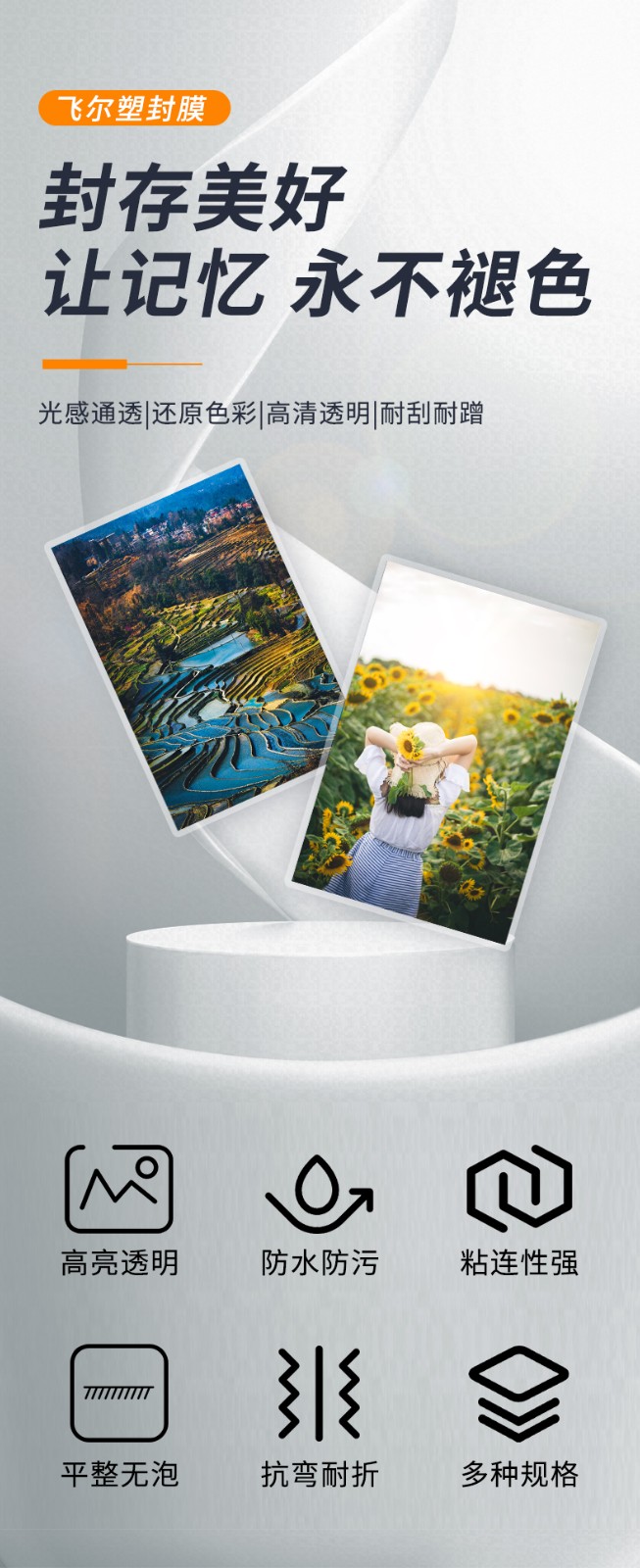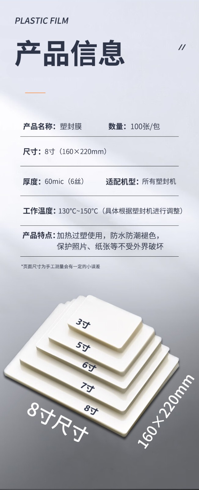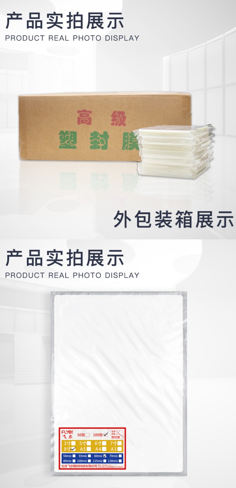 飞尔 塑封膜 照片过塑膜封塑膜 菜单热塑膜 文件过胶纸 树叶标本护卡膜 证件塑封机过塑纸覆膜纸 60min 8寸 100张/包 50包/箱 自营