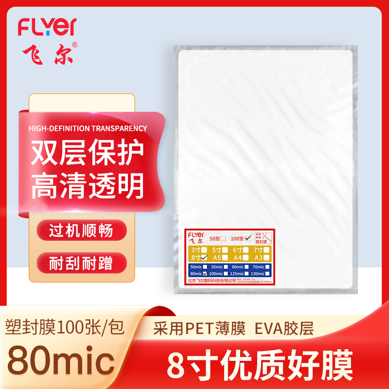 飞尔 塑封膜 照片过塑膜封塑膜 菜单热塑膜 文件过胶纸 树叶标本护卡膜 证件塑封机过塑纸覆膜纸 80min 8寸 100张/包 35包/箱 自营