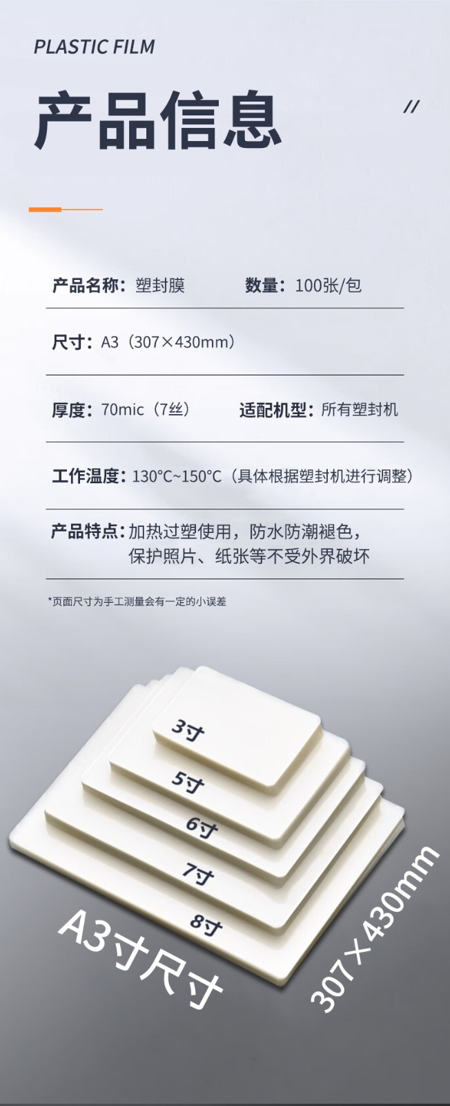 飞尔 塑封膜 照片过塑膜封塑膜 菜单热塑膜 文件过胶纸 树叶标本护卡膜 证件塑封机过塑纸覆膜纸 70min A3 100张/包 11包/箱 自营