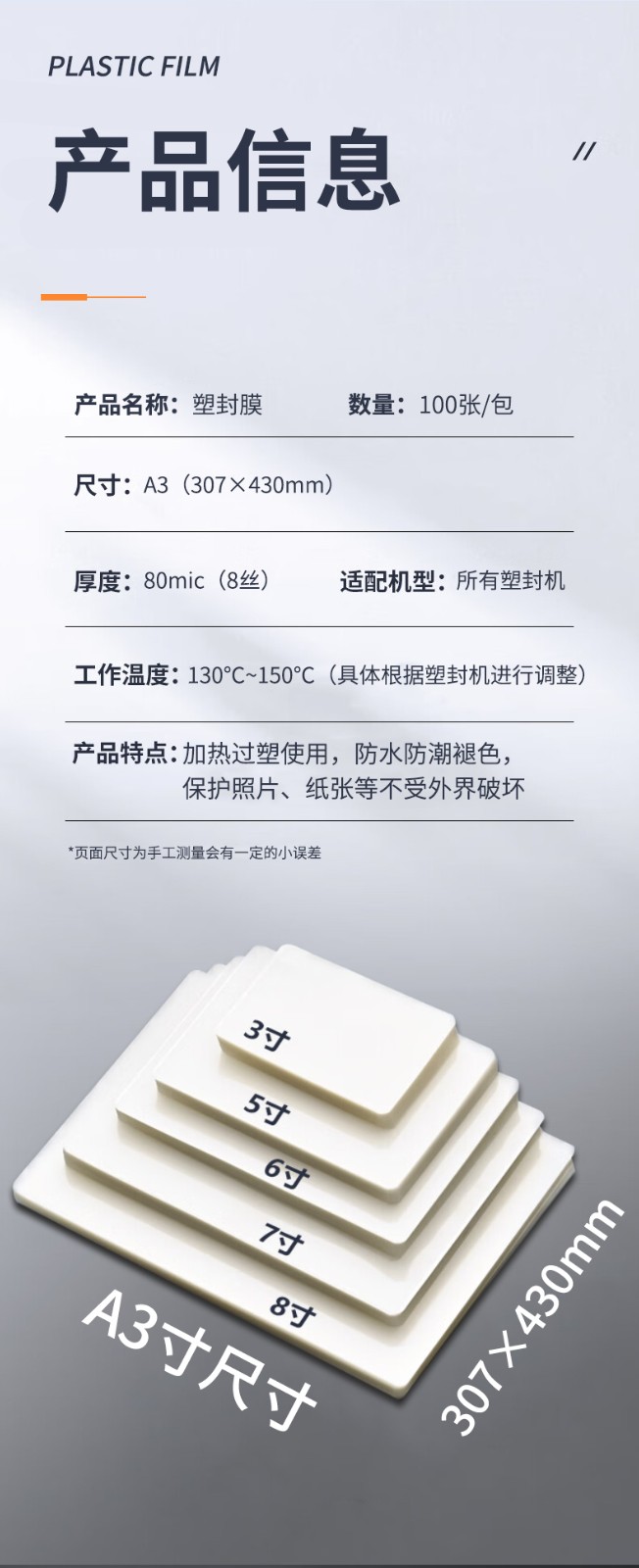 飞尔 塑封膜 照片过塑膜封塑膜 菜单热塑膜 文件过胶纸 树叶标本护卡膜 证件塑封机过塑纸覆膜纸 80min A3 100张 自营