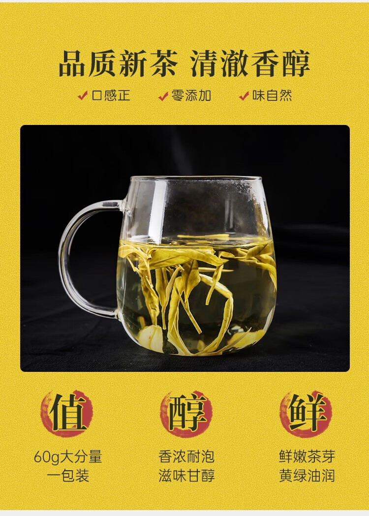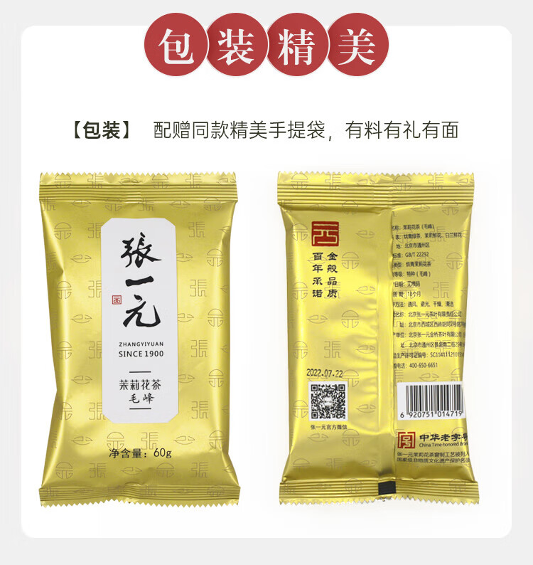 张一元 茉莉花茶 中华老字号茗茶鲜醇 特级茉莉花茶茉莉毛峰60g 1袋 自营