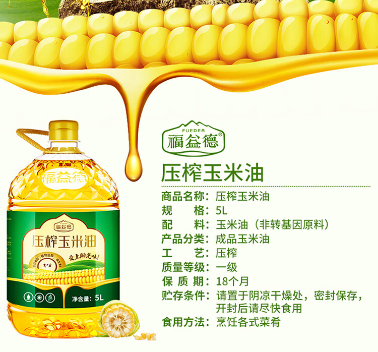 福益德 压榨玉米油 5L 玉米胚芽油 非转基因食用油 自营