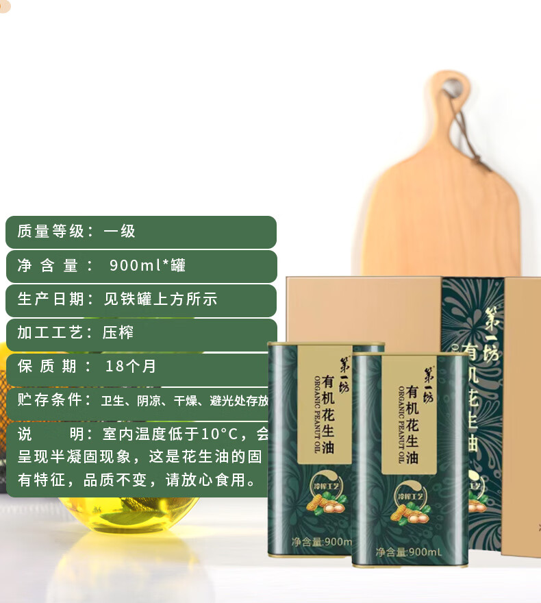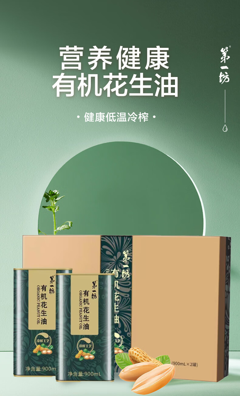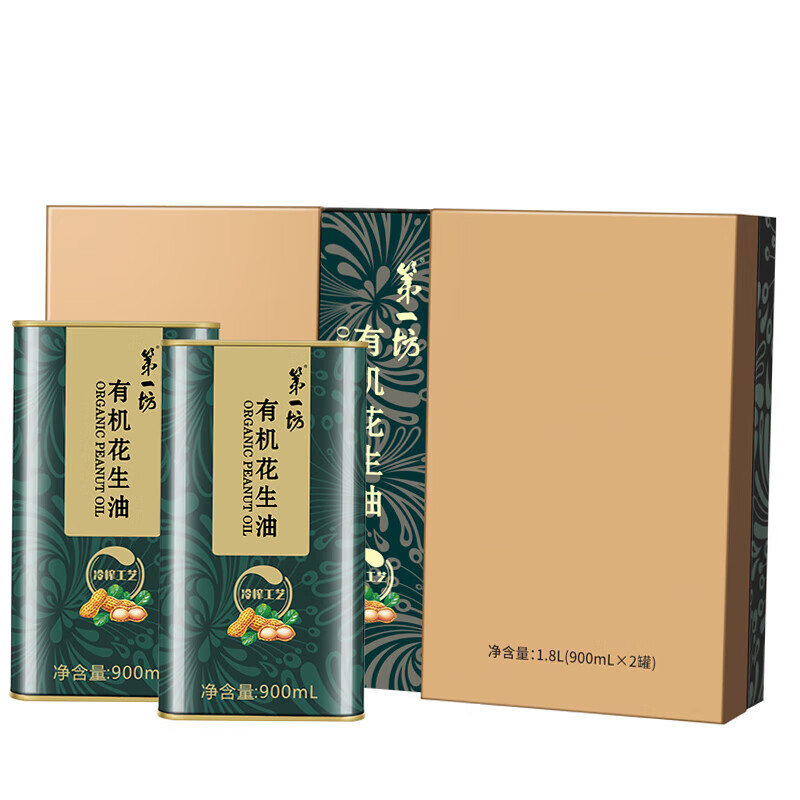 第一坊 有机花生油 900ml×2瓶 食用油 冷榨工艺 礼盒装 自营