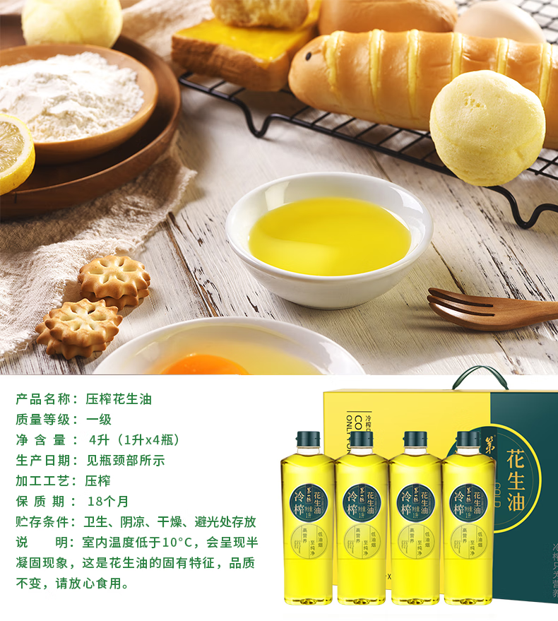 第一坊 花生油 1L×4瓶 食用油 冷榨工艺礼盒装 自营