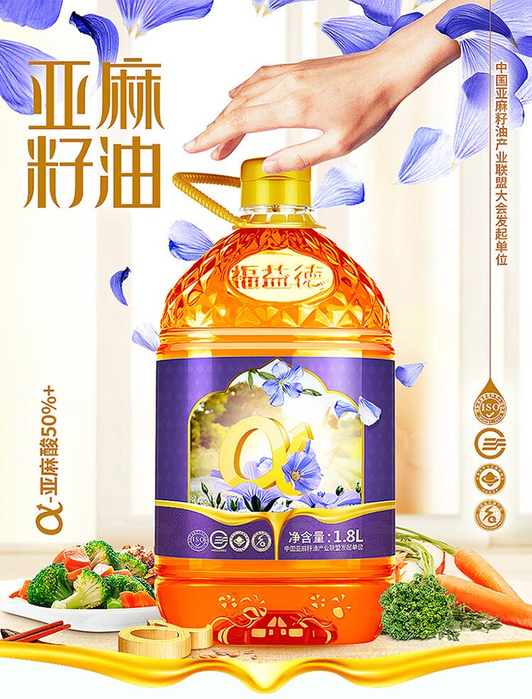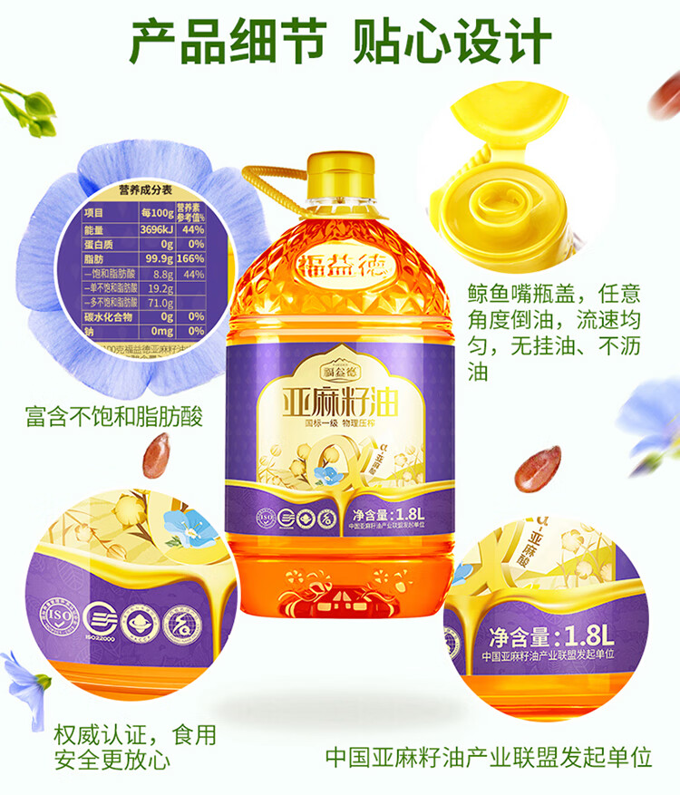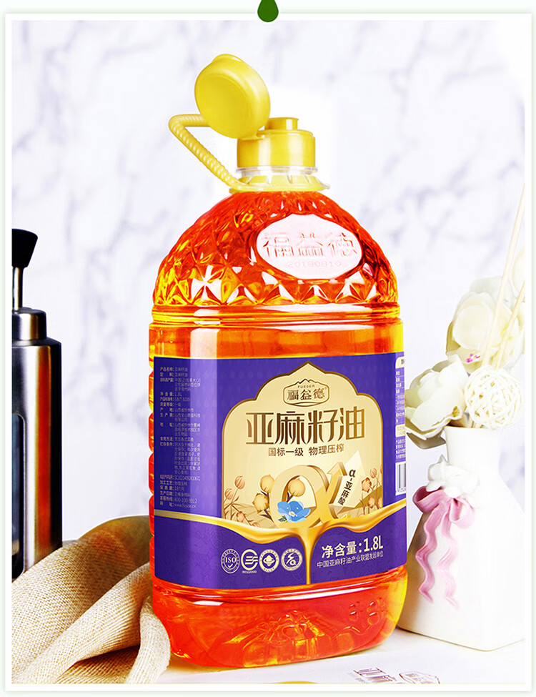 福益德 亚麻籽油 一级物理压榨 纯胡麻油月子油 大桶食用油 1.8L 自营