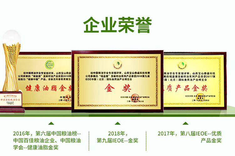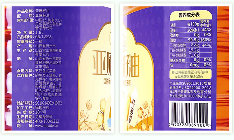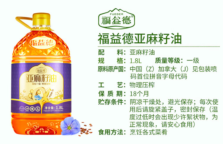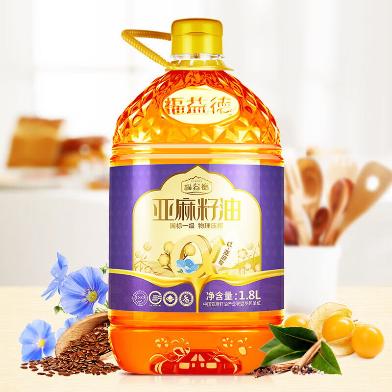 福益德 亚麻籽油 1.8L 大桶食用油 纯胡麻油月子油 一级物理压榨 自营