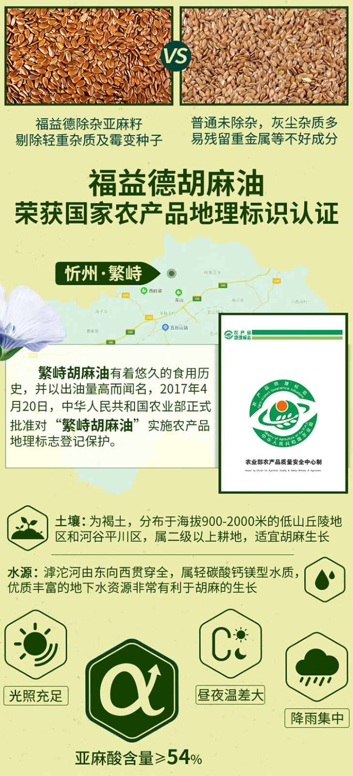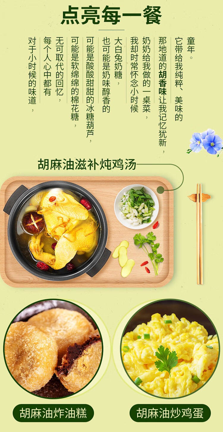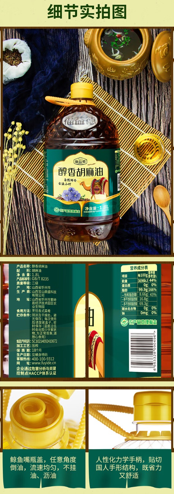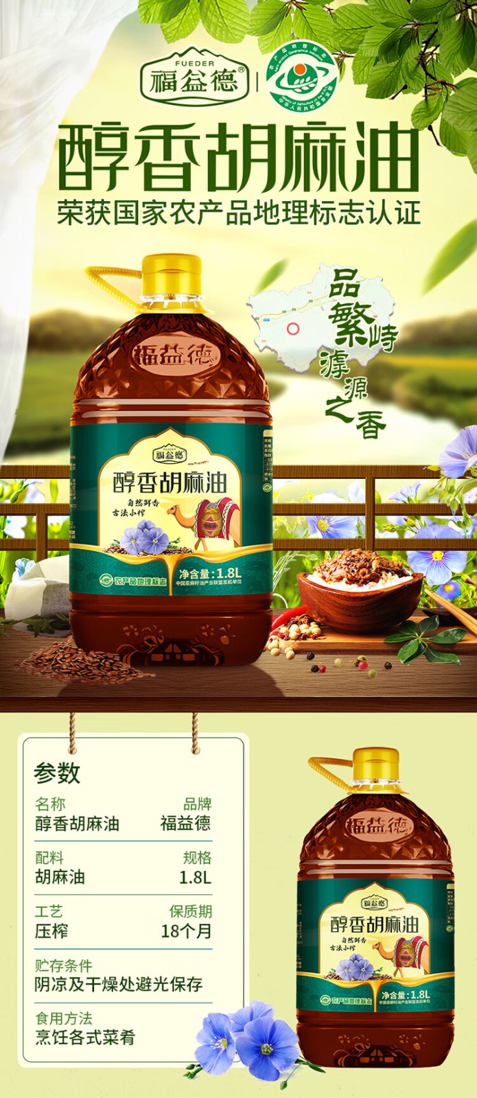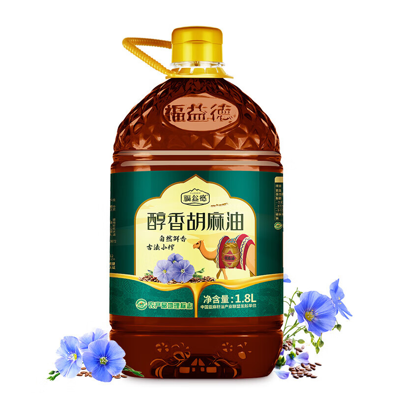 福益德 醇香胡麻油 1.8L×1桶 食用油 山西胡麻油 物理压榨纯亚麻籽油 自营