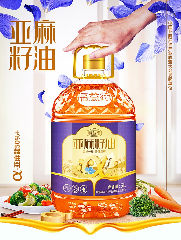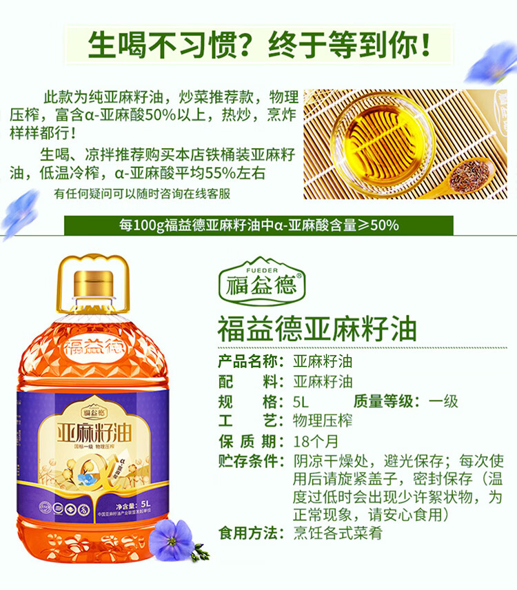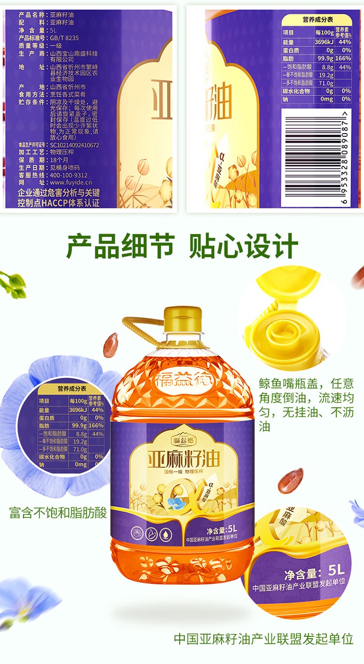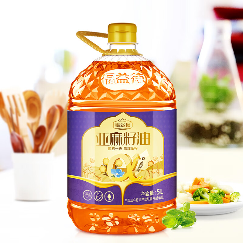 福益德 亚麻籽油 一级物理压榨 纯胡麻油月子油 大桶食用油 5L 自营