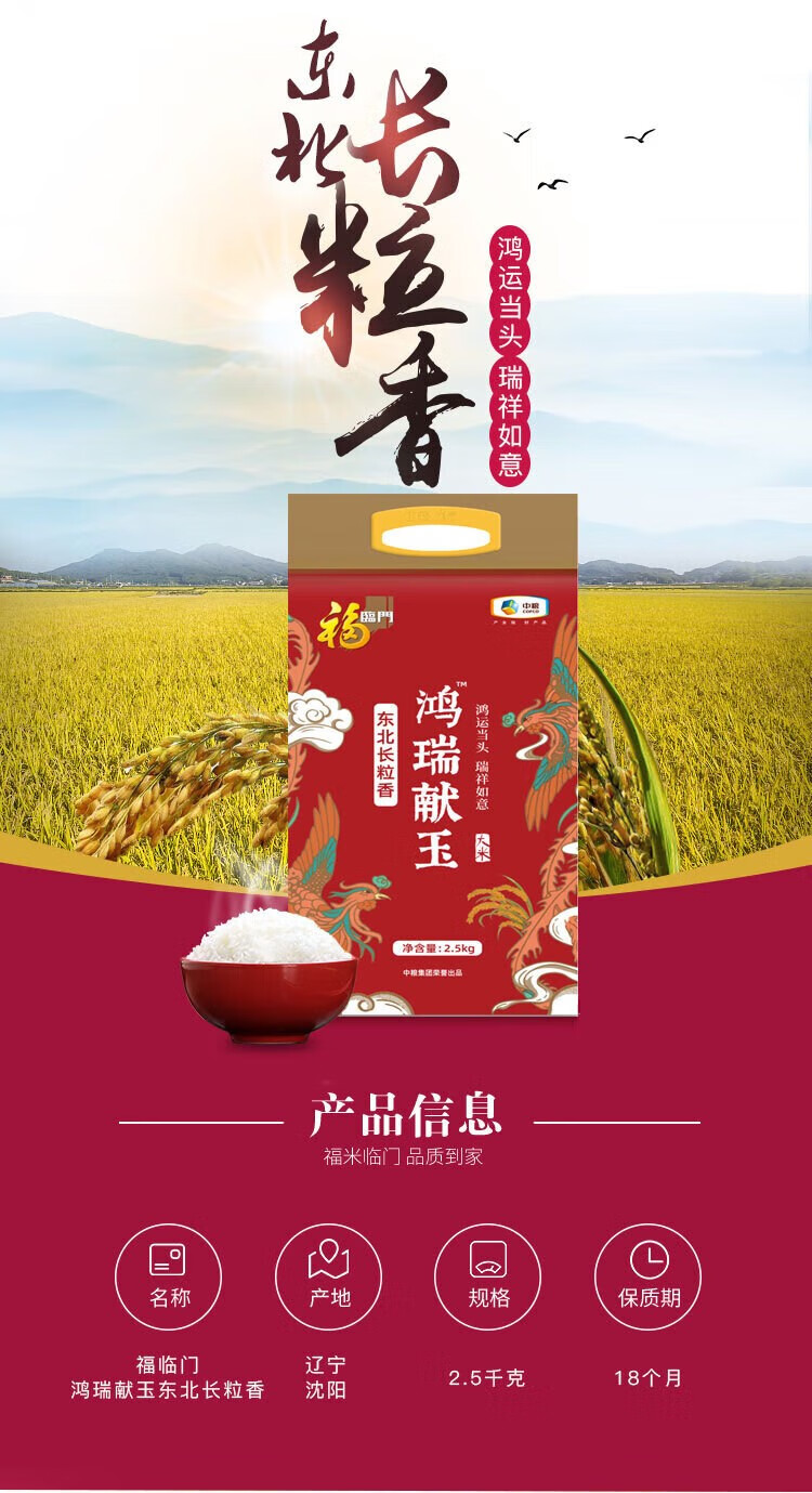 福临门 家庭装米饭大米多用途蒸饭熬粥早饭鸿瑞献玉东北长粒香2.5kg 自营