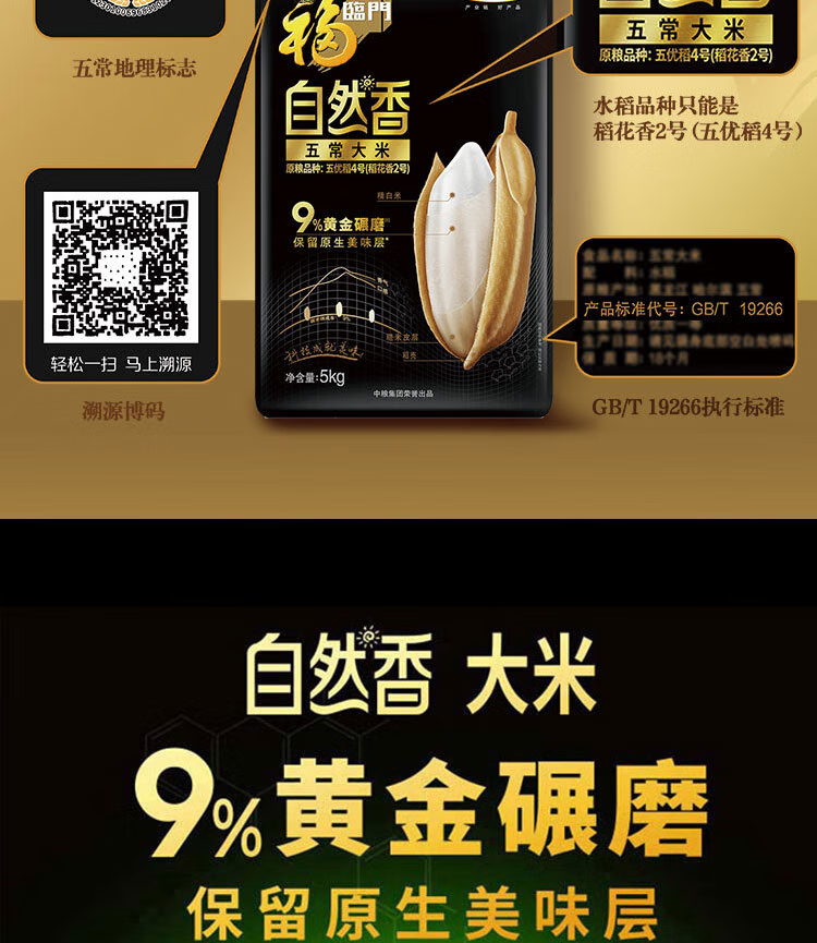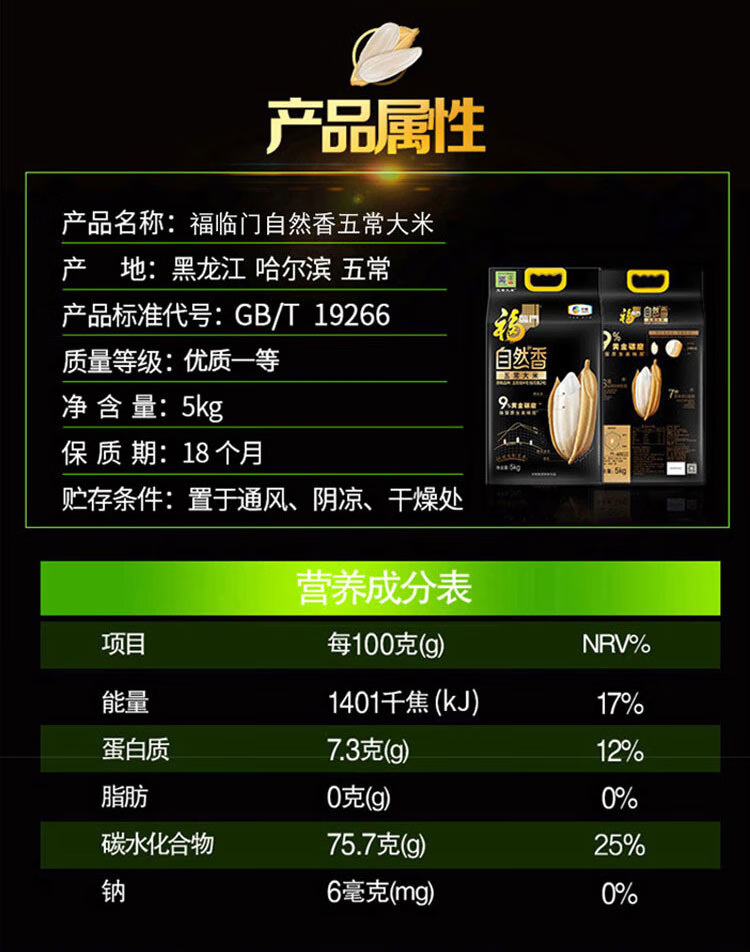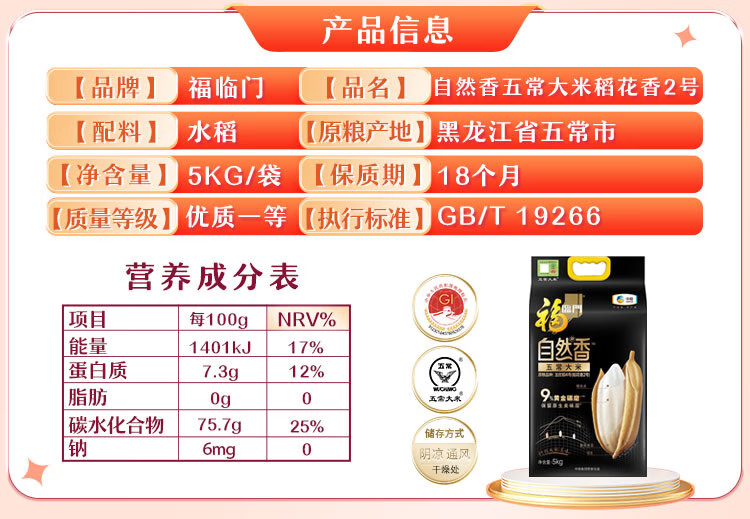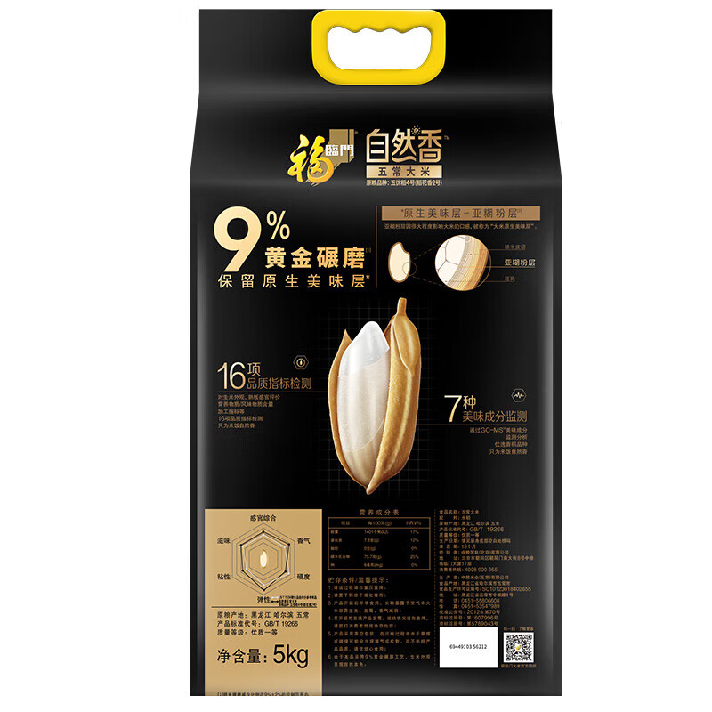 福临门 家庭装米饭大米多用途蒸饭熬粥早饭五常大米稻花香2号 5kg/袋 自营
