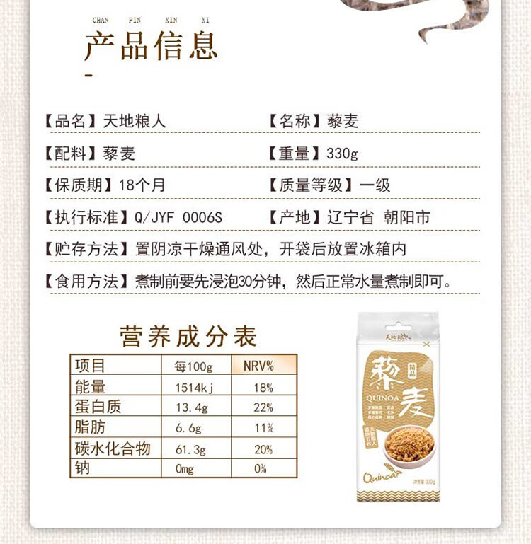 天地粮人 精品 藜麦 330g(粗粮杂粮 月子米 大米伴侣) 自营