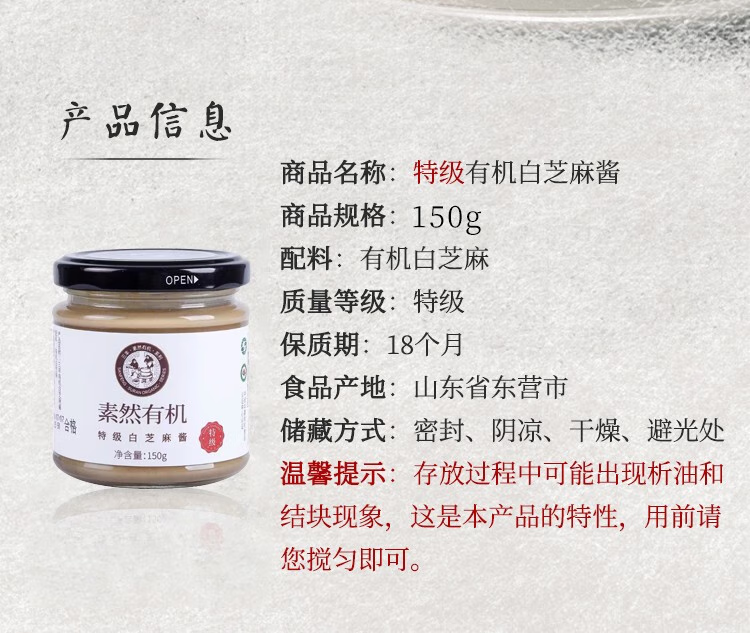 三丰 特级有机白芝麻酱 纯小磨麻汁调味品 拌菜拌饭酱料 150g 自营