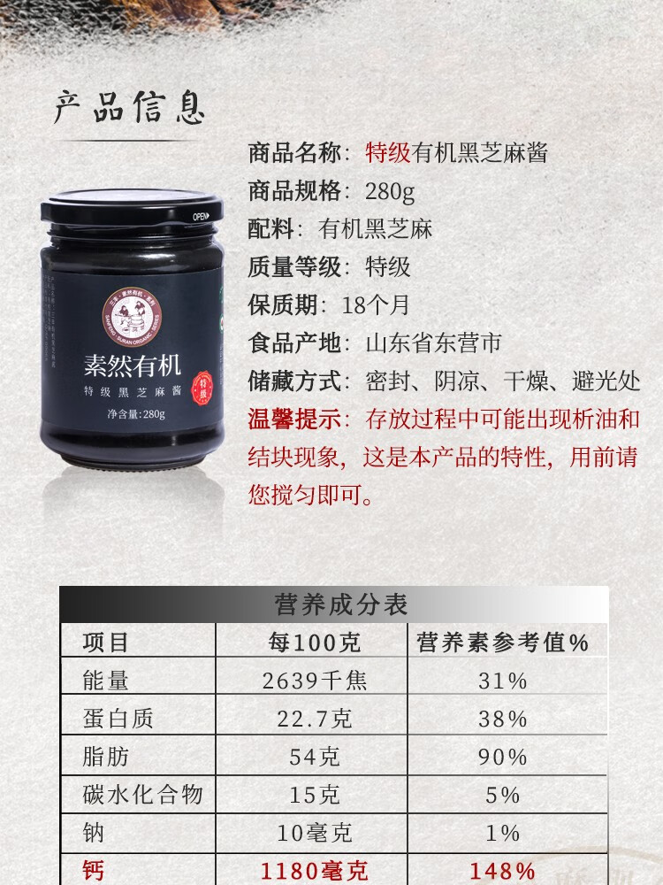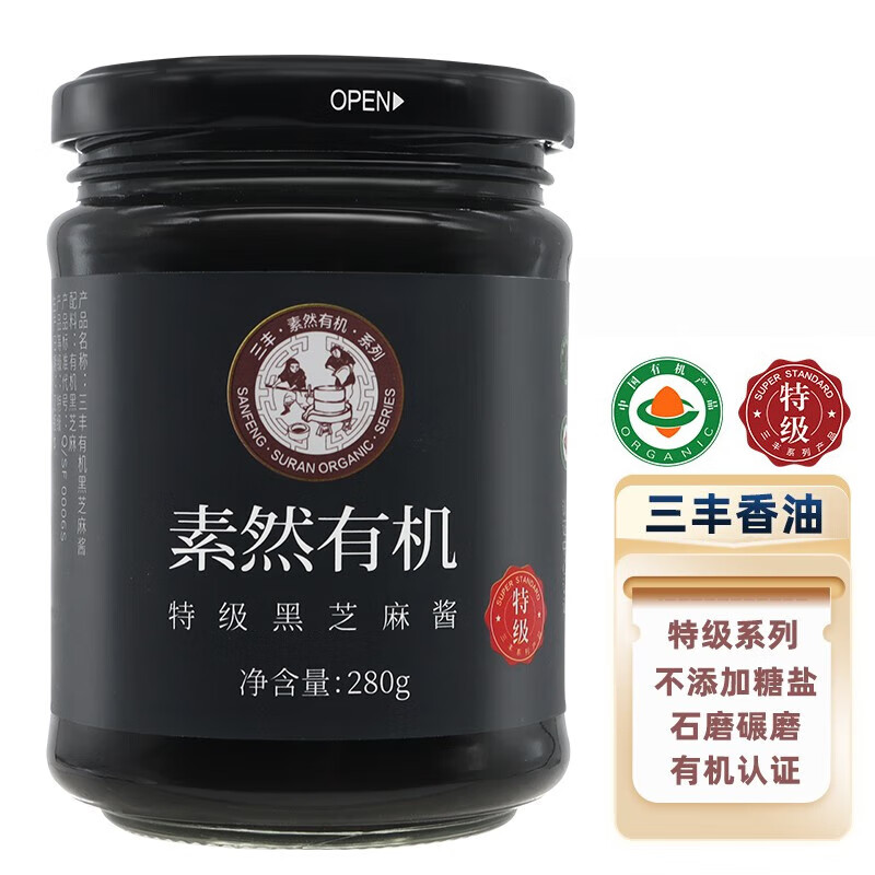 三丰 特级有机黑芝麻酱 纯小磨麻汁调味品 拌菜拌饭酱料 280g 自营