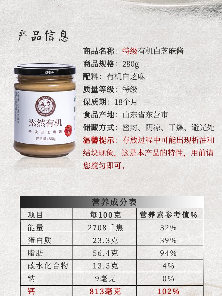 三丰 有机白芝麻酱 纯小磨麻汁调味品 拌菜拌饭酱料 280g