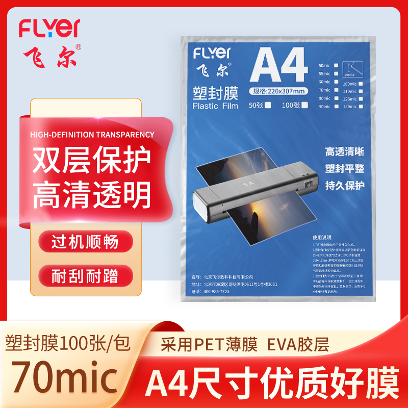 飞尔 塑封膜 照片过塑膜封塑膜 菜单热塑膜 文件过胶纸 树叶标本护卡膜 证件塑封机过塑纸覆膜纸 70min A4 100张 自营