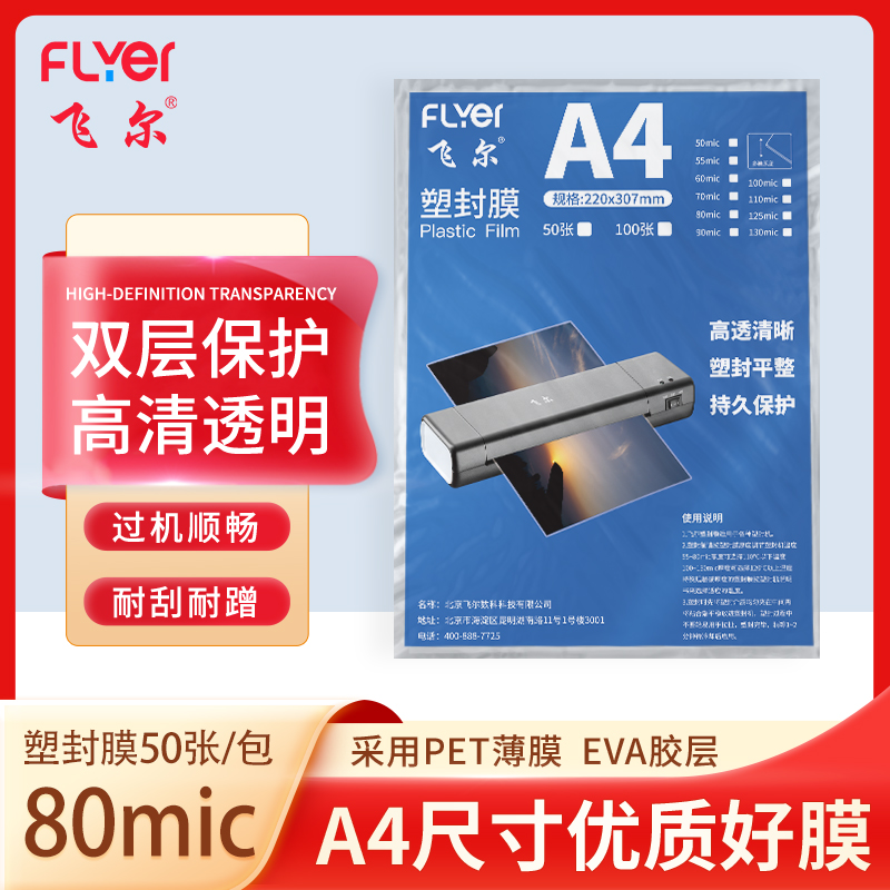 飞尔 塑封膜 照片过塑膜封塑膜 菜单热塑膜 文件过胶纸 树叶标本护卡膜 证件塑封机过塑纸覆膜纸 80min A4 50张 自营