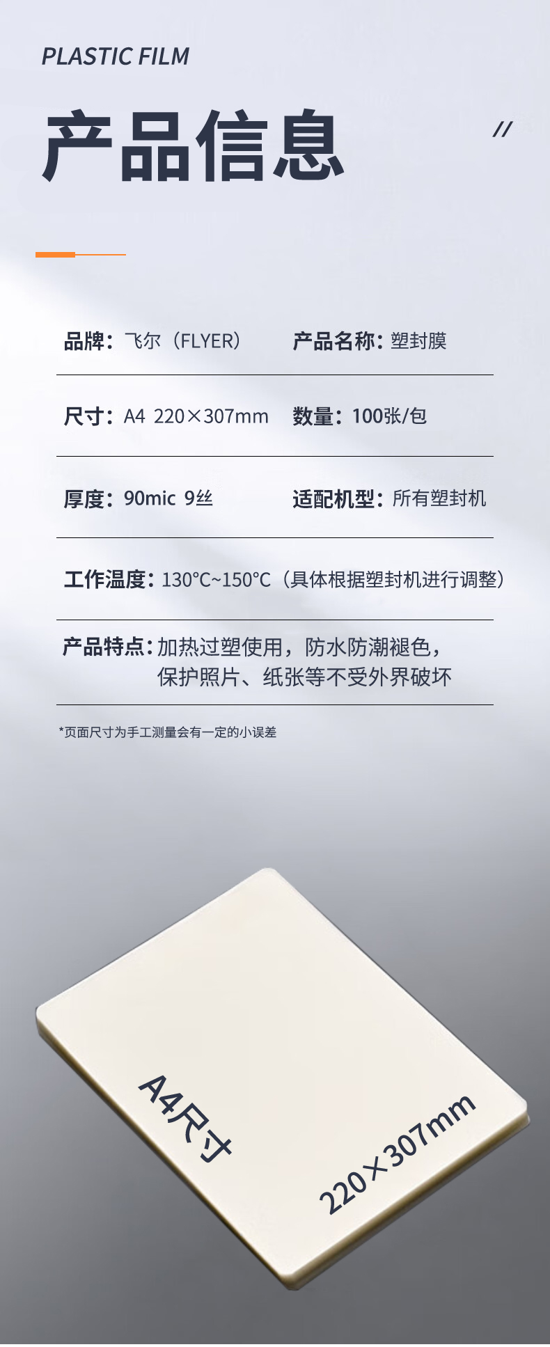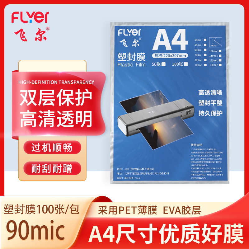 飞尔 塑封膜 照片过塑膜封塑膜 菜单热塑膜 文件过胶纸 树叶标本护卡膜 证件塑封机过塑纸覆膜纸 90min A4 100张/包 18包/箱 自营