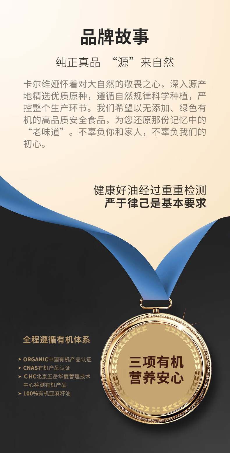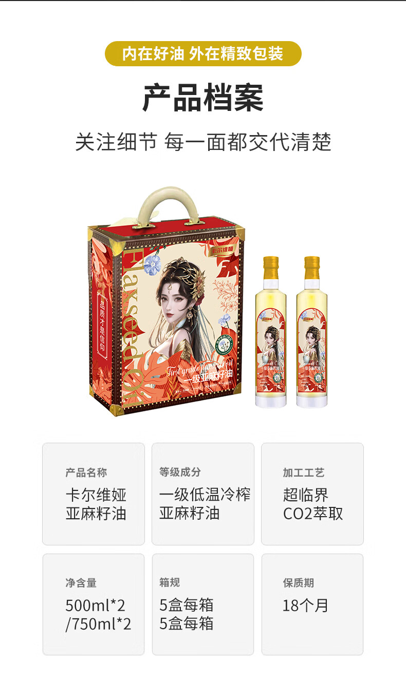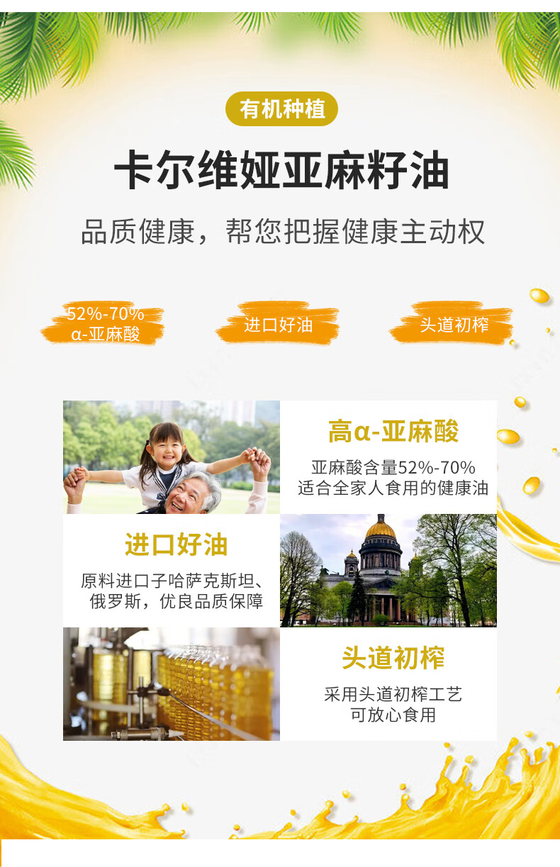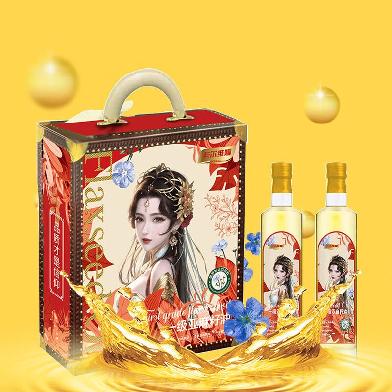 卡尔维娅 一级物理压榨有机亚麻籽食用油礼盒 风情精装750mL*2瓶 1盒 自营