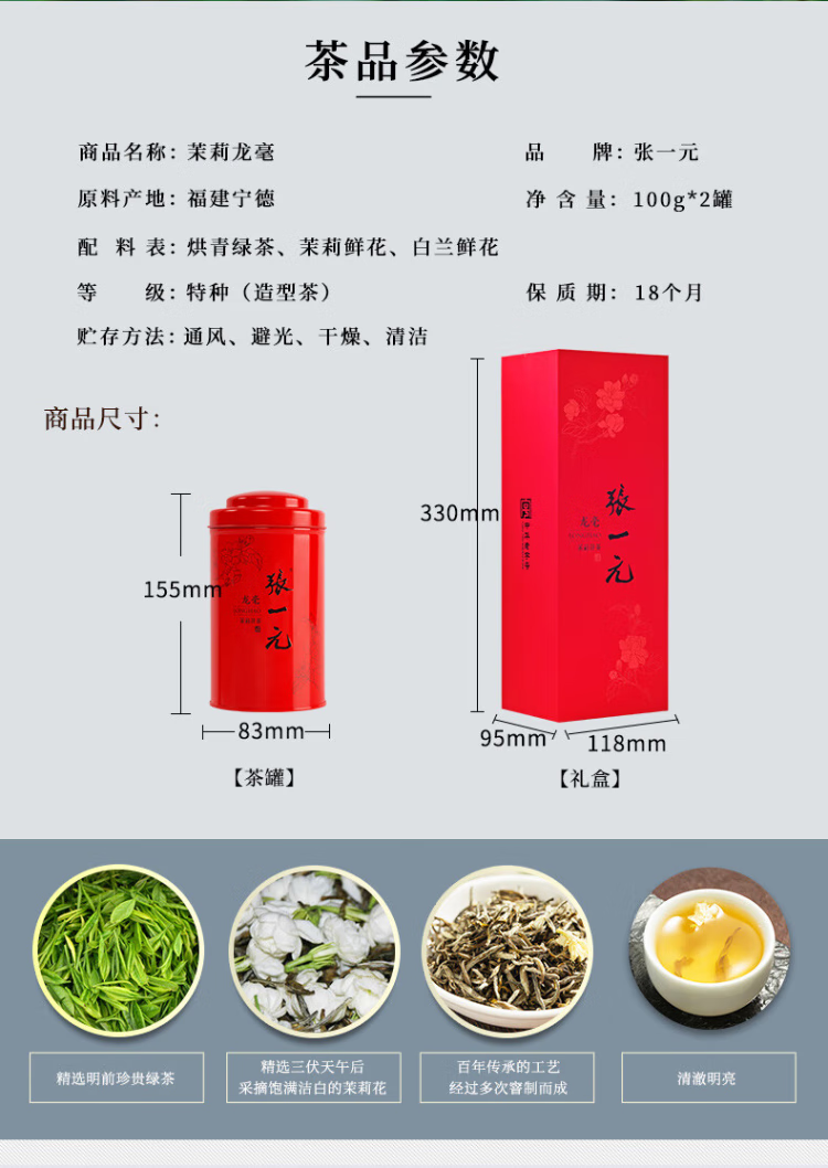 张一元 茶叶 特种浓香型茉莉花茶 精选八窨茉莉毛尖 200g×1罐