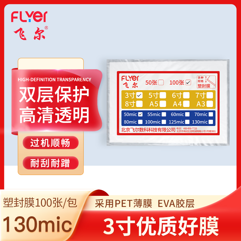 飞尔 塑封膜 照片过塑膜封塑膜 菜单热塑膜 文件过胶纸 树叶标本护卡膜 证件塑封机过塑纸覆膜纸 130min 3寸 100张/包 100包/箱 自营